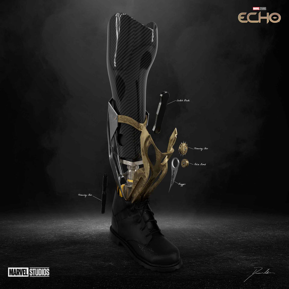 On Echo, I was brought on to rework and realize several key character and cultural elements in 3D. One of my main responsibilities was redesigning and modeling a prosthetic leg covering for Maya that incorporated hidden weapon compartments and embedded Choctaw design motifs. I adapted and evolved the original concept art to suit the practical prosthetic used on set. I worked closely with Russell Bobbitt and the props team to ensure both the look and function aligned with the character’s story.
